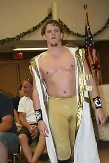 On May 17, Chikara announced the fifth match for the event, which would see commentator and ring announcer Gavin Loudspeaker take on Tim Donst.[1] Following Under the Hood, where he failed to capture the Chikara Grand Championship from Eddie Kingston, Donst continued a storyline mental collapse that had started in June 2012, when he lost his hair at Chikarasaurus Rex: How to Hatch a Dinosaur,[50] ultimately revealing that his "grand plan" was still in effect and did not involve him winning the Grand Championship, but instead unhinging Kingston and turning him into the "destroyer of Chikara" so that he himself could "rise up as the martyr of pro-wrestling".[51] In the start of 2013, Donst adopted Steve "The Turtle" Weiner and Veronica as his new followers, while also retaining Jakob Hammermeier as a follower.[41][52] The rivalry between Donst and Loudspeaker began following Chikara's first shows of 2013, when Donst took exception to Loudspeaker's claim that he was "not main event material".[53] Loudspeaker's outrage at Donst was fueled by his abusive treatment of his followers, especially Steve Weiner.[53] Several verbal exchanges between the two eventually led to Donst attacking Loudspeaker first on April 6, after losing to Archibald Peck, and again on May 4, following a loss against Saturyne, both times cutting off a lock of his hair.[32][45][53] Being a non-wrestler, Loudspeaker requested Chikara's Director of Fun Wink Vavasseur for an opportunity to manage one of his friends to take on Donst at Aniversario: Never Compromise.[54] However, Vavasseur turned down the request, remembering how Loudspeaker had questioned his abilities and capabilities in the past, and instead booked a match between Loudspeaker and Donst for the event, calling it a "character-building exercise".[22][55] In a blog entry on Chikara's official website, Loudspeaker announced that he had started training at The Wrestle Factory under the likes of Green Ant and Hallowicked, while also making a plea for Donst's longtime associate Jakob Hammermeier to come to his senses and realize that Donst was not his friend.[11][22] On May 24, Chikara announced an added stipulation for the match, where the loser would have his hair shaved off.[1]