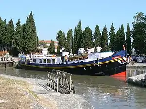 Anjodi was purchased by Derek Banks in 1982 from a Dutchman, Fopa de Jong, in Amsterdam.[1][2] She was a retired trading barge and full of old World War II aircraft instruments. The refit in 1982-1983, by European Waterways, made Anjodi one of France's first ever hotel barges.[1] Before making the three-month trip from the Netherlands to the south of France, Anjodi was towed to a shipyard in Belgium where tanks for fresh water, generators, wiring and plumbing were installed and a shell infrastructure of steel was built.[1] She is refurbished on an annual basis and [3] currently operates on the Canal du Midi in southern France.