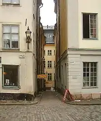 Ankargränd (Swedish: "Anchor Alley") is an alley in Gamla stan, the old town of Stockholm, Sweden, connecting the streets Trångsund and Prästgatan, just west of church Storkyrkan. Ankargränd is a parallel street to Storkyrkobrinken, Spektens gränd, Solgränd, and Kåkbrinken.