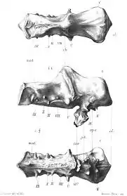 The neurobiology of ankylopollexians has been studied as far back as 1871, when a well preserved cranium (specimen NHMUK R2501[15]) discovered in September 1869 from the Wealden Group on the Isle of Wight and tentatively referred to the genus Iguanodon was described by John Hulke. He noted that due to the lesser correlation of the shape of the brain and wall of cranial cavity in reptiles, any deduction of the shape of the brain of the animal would be approximate.[16] The referral of this skull was reinforced in a later study, published in 1897. It was here inquired that the brain of the dinosaur may have been more closely associated to the cavity than that of modern reptiles, and so an endocast was created and studied.[17] This was not the first endocast of an ankylopolloxian brain, for in 1893, the skull of a Claosaurus annectens (today referred to the genus Edmontosaurus[18]) was used by Othniel Charles Marsh to create a cast of the brain cavity. Some basics remarks were made, including the small size of the organ, but interpreting minute features of the organ was noted to be difficult.[19] The 1897 paper noted the similarity of the two endocasts.[17]
