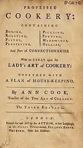 - Professed Cookery had the subtitle "containing boiling, roasting, pastry, preserving, pickling, potting, made-wines, gellies, and part of confectionaries. With an essay upon the lady's art of cookery; together with a plan of housekeeping".[23]
