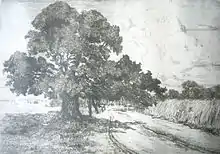 The many landscapes she produced of the countryside in and around Worpswede apply very different techniques. Some, notably from her particularly productive period around 1903/04, apply a much more generous technique with less concern for perspective and little sign of the meticulous detail of the cityscapes. The landscapes tend to use aquatint. Their expressive quality is achieved not so much by invoking a wide range of different colours as through a velvety variability of the shading, achieved through the alternative technology selected.[1]