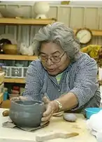 Aiming to remain true to the techniques and designs of Southeastern pottery making and determined to preserve ancestral methods,[2][16] Mitchell began with low-firing clay. She later mixed it with high-firing porcelain clay to obtain a stronger, but lighter, result. Grinding, pounding and sifting the clay to remove large particles, Mitchell worked to soften the clay and then tempered it with ground shells and sandstone before adding water.[17] To shape the pot, she had to replicate stamping tools and wooden paddles based upon designs she had seen on pottery fragments in museums.[15] After the vessel was formed and to maintain the historic color palette of gray, red, and yellow, she then brushed on slip, made from the clay on her land,[18] and fired it over an open pit fire. Placing the pots on a metal sheet above a brick enclosure, where a wood fire was kept burning for an entire day, Mitchell allowed them to harden and gradually cool as the fire burned out.[2] Once cooled, pieces were burnished with small stones to create a smooth texture.[19]