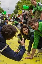 On 27 January 2018, at the Green Party's national convention in her hometown of Hanover, Baerbock was elected as one of two equal chairpersons of her party at the federal level, with Robert Habeck.[20][25] She won 64% of the vote, more than her challenger, Anja Piel.[9] At a 2019 party convention, she was re-elected with 97.1% of the votes, the highest-ever result for a party chair.[26]