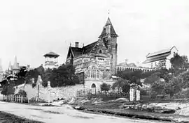 Young began turning the Johnston estate into an attractive suburb by building a number of picturesque houses. One of those houses was Kenilworth, with a "witch's cap" style of roof common to that period of architecture, which Young rented to Henry Parkes, father of Federation and former Premier of NSW. Kenilworth was sold for $3.35 million in 2007.[5] Other houses in the group were The Abbey, Oybin, Rozelle (now demolished), Greba, Hockingdon, Highroyd and Claremont (now demolished).[6] Some of the houses are popularly known as "witches houses" because their towers resemble witches' hats. Highroyd was given a major restoration which took twenty years and was completed in 2009. The restoration was supervised by heritage architect David Springett and Highroyd was nominated for the heritage category of the Australian Institute of Architects New South Wales awards in 2009.[7]