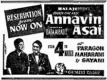 Annavin Aasai (transl. The elder brother's wish) is a 1966 Indian Tamil-language drama film directed by Dada Mirasi and produced by Balaji. A remake of the Hindi film Chand Aur Suraj (1965), it stars Gemini Ganesan, Savitri, Balaji and Vijaya. In the film, after a man's faked death, the lives of his family change drastically when they receive money from an insurance company he cheated.