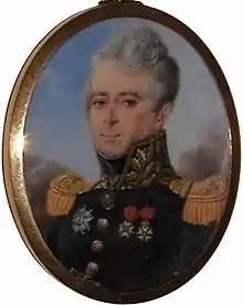 On 21 June 1813 at the Battle of Vitoria, Trelliard commanded the 1,038 horsemen in his four French dragoon regiments as part of the Army of the Center.[23] After Marshal Nicolas Soult reorganized the army in the late summer of 1813, he led a 2,358-strong cavalry division consisting of six regiments.[24] During the Battle of the Pyrenees at the end of July, the division included the 4th, 14th, 16th, 17th, 21st, and 26th Dragoon Regiments.[25] At the Battle of the Nive on 10 December 1813, Louis-Ernest-Joseph Sparre's dragoon brigade of his division overran the 1st Portuguese Line Infantry Regiment.[26] Trelliard and his division were transferred to eastern France shortly after the battle.[27]