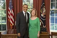 She was appointed as the first female Ambassador of Ireland to the United States[9] by the Irish Government on 15 January 2013.[10] She arrived in Washington, D.C. in August,[3][4] and presented her credentials to President Barack Obama at a ceremony in the White House Oval Office on 17 September.[11] Anderson's stated agenda during her term in Washington included attention to U.S. immigration reform and its potential for undocumented Irish and other immigrants to achieve legal status. She focussed on economic matters and hoped to increase mutual trade, investment, and tourism between the two countries. She was also interested in exploring and building Ireland's cultural identity in the U.S. context by working with the cultural community.[1][3][11]