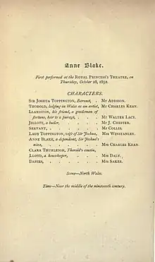 Anne Blake is an 1852 melodrama by the British writer John Westland Marston.[1] [2] It premiered at the Princess's Theatre in London on 28 October 1852. The original cast included Charles Kean as Thorold, Walter Lacy as Llaniston, Ellen Kean as Anne Blake. The same year it appeared at the Broadway Theatre in New York.