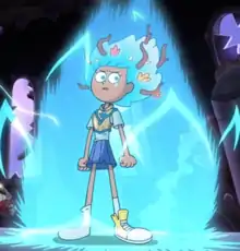 After living in the jungle for two weeks, she is found by Sprig Plantar and quickly befriends him. She is discovered by the rest of the Plantars and the town of Wartwood who reluctantly let her stay with them.[5] While slightly angsty around the Plantars at first, she realizes that they want to care for her and does her best to please them, especially Sprig who she has a lot in common with.[28] She lives in their basement which is prone to flooding.[29] Over time, Anne grows to love the family as her own and does not wish any harm come to them,[30][31] While the Wartwood citizens openly mock her at first, they slowly warm up to her and accept her as one of them after she protects them from debt collector Toads that the Mayor had cheated.[32] After the Wartwood citizens throw a celebration for her, Anne is reunited with Sasha who she learns is in league with the Toad Warriors. [33] Anne eventually comes to the realization that Sasha had been manipulative of her throughout their friendship and is forced to fight her. They become separated afterward, with Anne becoming distraught over losing her but promising to make things right with her in the future.[34]