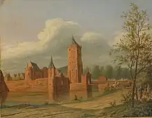 Anne Joanne married at Broich Castle near Mülheim an der Ruhr[6] on 19 June 1619[1][note 4][6] to Johan Wolfert van Brederode (Heusden (?),[8] 12 June 1599[9] – Petersheim Castle near Maastricht,[10] 3 September 1655[11]), Lord of Brederode, Vianen, Ameide and Kloetinge. The castle where the marriage took place was the Residenz of Count John Adolf of Daun-Falkenstein-Broich, the husband of Anne Joanne’s sister Anne Mary. Johan Wolfert brought all his goods in the marriage, while Anne Joanne brought 12,000 guilders, of which the interest was 600 guilders annually, and her own goods and jewellery. As a dower she was granted Haaften Manor and 4000 guilders annually.[6] According to an eyewitness, the marriage contract and the testaments were signed on 19 June and ‘habe dauraufhin die Kopulation stattgefunden und die Hochzeit bis auf Mittwoch, den 23. Juni, gewährt’ (‘thereupon the copulation took place and the wedding was celebrated until Wednesday, 23 June’). After the festivities the young couple travelled by coach to Wesel, whereupon Prince Maurice of Orange’s yacht took them to Vianen. Two of Anne Joanne’s brothers were in the party: William and fourteen-year-old John Maurice. A painting by Cornelis Vroom in the town hall of Vianen shows the arrival of the couple on the River Lek.[12]