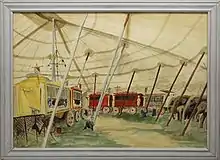 Marsh's style was realist. Her Watercolors, oil paintings, and wood engravings all drew critical notice. In 1935, Margaret Breuning, critic for the New York Post said her watercolors showed an "appreciation of the character of the medium, not only in their easy fluency of gay color but in their unpretentious simplicity and freedom."[1] At the same time Howard Devree of the New York Times wrote that her paintings resembled those of Hopper, Burchfield and Sanford Ross, but added that she was "preoccupied with the romantic, exciting, poetic and beautiful values in the commonplace" and said she captured them "sometimes rather dazzlingly—with a joyous brush."[14] Reviewing a group show held in 1936 at the Art Mart, Howard Devree wrote that Marsh's "large and pleasing "Morning at the Circus" (shown at right) in particular deserves to be noticed by the visitor."[10] A Times review published in 1937 noted that she applied "wash smoothly and with clear definition." The author said, "her color is pleasing and her work continues to gain facility."[7] That critic also called attention to a wood engraving called "Holland Tunnel" that Marsh had made in 1930, saying it was one of her more interesting works on paper.[7] This print, shown at left, illustrates her early style. In 1943, reporting on a group show at the Studio Gallery,[note 6] the critic for the Brooklyn Daily Eagle, A. Z. Kreuze, said Marsh had a "sound facility" in wood engraving and praised one of her prints for its well managed distribution of light.[28] In reviewing a group show held by the New York Society of Women Artists ten years later, Devree called attention to a wood engraving called "Intermission" (shown at right).[29] In 1966 the New Jersey State Museum gave Marsh a purchase award for "In the Corner," an oil painting of about 1962 (shown at left). A critic noted at the time that she competed against "far more celebrated names" in winning the award.[25] In 1995, looking back on her artistic career, a critic said "her wood engravings combine powerful design with painstakingly refined execution."[30]