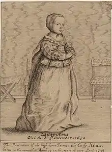 Anne was born on 17 March 1637 at St. James's Palace, the sixth child and third daughter of King Charles I of England and his queen, Henrietta Maria of France.[1] Her siblings were, in order of birth: Charles James, Duke of Rothesay and Cornwall (13 May 1629); the future Charles II of England; Mary, Princess Royal and future Princess of Orange; the future James II of England and Elizabeth of England. Anne was baptised an Anglican at St. James's Palace on 30 March, by William Laud, the Anglican Archbishop of Canterbury.[2][3] Anne only lived to see the birth of two siblings: the short lived Catherine (29 June 1639) and Henry Stuart, Duke of Gloucester. She died before the birth of her sister, Princess Henrietta of England, who married Philippe I, Duke of Orléans and had four children by him.