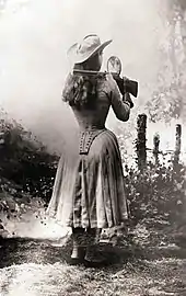 Oakley urged that women serve in war, though President William McKinley rejected her offer of woman sharpshooters for service in the Spanish–American War.[35] Beyond this offer to the president, Oakley believed that women should learn to use a gun for the empowering image that it gave.[70] Laura Browder discusses how Oakley's stardom gave hope to women and youth in Her Best Shot: Women and Guns In America. Oakley pressed for women to be independent and educated.[70] She was a key influence in the creation of the image of the American cowgirl. Through this image, she provided substantial evidence that women are as capable as men when offered the opportunity to prove themselves.[71]