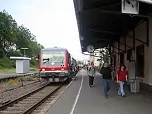 Deutsche Bundesbahn (DB), which was responsible for railway operations from 1949, assigned the station to the railway division of Mainz, which was responsible for all railway lines within the newly created state of Rhineland-Palatinate. In the course of the staged dissolution of the railway division of Mainz from 1 August 1971, its counterpart in Saarbrücken took responsibility for the station.[15] At the same time the platforms were raised.[16] In 1996, the station became part of the area where services are organised by the Verkehrsverbund Rhein-Neckar (Rhine-Neckar transport association, VRN). Since 2002, the tickets of the Karlsruher Verkehrsverbund (Karlsruhe Transport Association, KVV) have also been recognised. DB Station&Service commissioned a passenger information display at the station on 1 January 2009. In 2014, the platforms were to be upgraded for disabled people.[17]