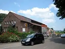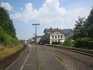The entrance building was built in the neoclassical style for the commissioning of the station in 1874. It is protected under the Rhineland Palatinate Conservation Act. In its execution it was almost identical with its original counterpart at Biebermühle station (now Pirmasens Nord station).[18] The front-gabled central section of the building has three floors. Two two-storey wings are attached to it. The platform canopy was completed a few years after the station was opened.[19] Similar buildings were found on the lines of the Palatinate Railways (Pfälzische Eisenbahnen) as well as the stations of Enkenbach, Kirchheimbolanden, Langmeil and Marnheim.[20]