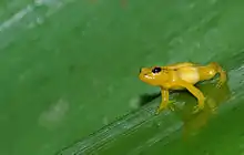 Anomaloglossus beebei (common names: Beebe's rocket frog, golden rocket frog) is a species of frog in the family Aromobatidae. This frog is endemic to Guyana, specifically in the Kaieteur National Park. It mainly survives on the giant bromeliad called Brocchinia micrantha.[2] The phytotelmata of this bromeliad is the site of oviposition and tadpole rearing and are defended over time by the males. The females of this species are more brightly golden colored whereas males are more of a dull tan with brown pigmentation.[3] Males take care of offspring and are preferred due to the elongation of their calls.[4]