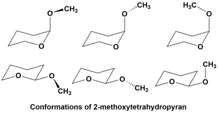 An example of this is 2-methoxytetrahydropyran. As the anomeric effect predicts, the methoxy substituent shows an increased preference for the axial conformation. However, there is actually more than one possible axial conformation due to rotation about the C-O bond between the methoxy substituent and the ring. When one applies the principles of the reverse anomeric effect, it can be predicted that the gauche conformer is preferred, suggesting the top left conformation is best in the figure above. This prediction is supported by experimental evidence. Furthermore, this preference for the gauche position is still seen in the equatorial conformation.[15]