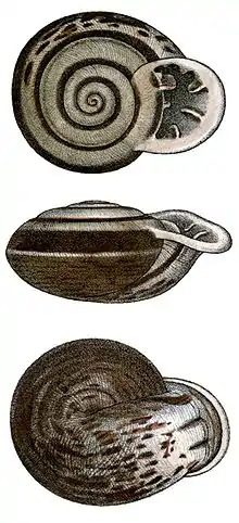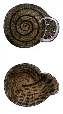 Adult snails in this genus have an extremely unusual shell morphology: the aperture of the adult shell faces directly "upwards", in other words, in the same direction as the spire.[3] This seemingly impossible arrangement is made possible because the adult shell is carried upside down.