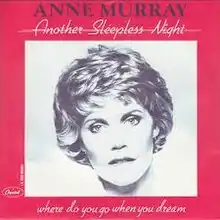 "Another Sleepless Night" is a song written by Charlie Black and Rory Bourke, and recorded by Canadian country music artist Anne Murray. It was released in January 1982 as the fourth single from her album Where Do You Go When You Dream. The song reached No. 1 on the RPM Country Tracks chart in Canada[1] and #4 on the Billboard Hot Country Singles chart in the United States.[2]