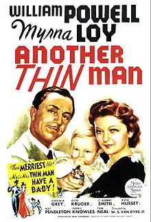 Another Thin Man is a 1939 American detective film directed by W. S. Van Dyke, the third of six in the Thin Man series. It again stars William Powell and Myrna Loy as Nick and Nora Charles and is based on Dashiell Hammett's Continental Op story "The Farewell Murder".[1] The Charles' son Nicky Jr. is introduced for the first time. The cast includes their terrier Asta, Virginia Grey, Otto Kruger, C. Aubrey Smith, Ruth Hussey, Nat Pendleton, Patric Knowles, Sheldon Leonard, Tom Neal, Phyllis Gordon and Marjorie Main. Shemp Howard appears in an uncredited role as Wacky.[2][3]