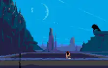 The game was influenced by works that Chahi liked at the time. The art and atmosphere were influenced by science fiction books such as Dune, artists such as Michael Whelan, and comic illustrators such as Richard Corben.[13] Manga such as Akira Toriyama's Dragon Ball influenced the way it suggests a lot with very little, character blurring effects such as the use of thin lines to suggest fast motion, and charging power attacks influenced by the Kamehameha.[14][15] The game's art style and atmosphere also drew influence from science fiction or fantasy art, including artists such as Frank Frazetta, Bernie Wrightson, and Zdzisław Beksiński, as well as the novel Hyperion. The laser blasters were also influenced by Star Wars.[15]