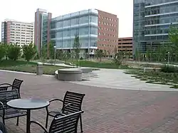 The Anschutz Medical Campus is a 256-acre (1.0 km2) campus for the University, UCHealth University of Colorado Hospital, and Children's Hospital Colorado.[36] All of the facilities on the campus, with the exception of the former Fitzsimons Hospital (referred to as 500 Main, or "Building 500" and Officially renamed Fitzsimmons building in 2018[52]), are new construction.[49] A series of distinct quadrangular zones on the campus governs its architectural design: the research quadrangle, consisting of the three Research Complex towers, features a contemporary glass and metal design, Research Complex I and II were designed by Fentress Architects in association with Kling Stubbins; the education quadrangle is characterized by a brick aesthetic; and the core quadrangle is located on the central axis of the campus, and anchored by Building 500.[49] The 116,000-square-foot (10,800 m2) medical library is located along the center quadrangle of the campus, and was designed as a joint venture between Davis Partnership Architects of Denver and Centerbrook Architects & Planners.[53]