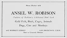 Ansel W. Robison was one of the cofounders of the San Francisco Zoological Society[7] and eventually chairman of the board of directors.[42] Robison was also a representative of the National Retail Pet Dealers Association.[43] The Robison company also packaged and sold bird and dog food. When Ansel W. Robison died in 1975, Robison of San Francisco was said to be the last surviving California Gold Rush-era business still in the family of the founding merchant.[44]