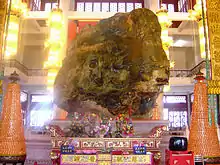 The statue was sculpted from a piece of jade 7.95 metres (26.1 ft) high, 6.88 metres (22.6 ft) wide, 4.10 metres (13.5 ft) thick, weighing 260.76 tonnes (574,900 lb).[3] The front of the stone has been carved with an image of Sakyamuni (a.k.a. Gautama) Buddha. On the back of the stone Guanyin (a.k.a. Avalokitesvara) Buddha has been carved. The jade stone was found on 22 July 1960 in Xiuyan County of Anshan which is known as the "hometown of jade" (Xiuyan jade is not really jade, but Serpentinite). It was declared a treasure of the State and listed as a protected property by Chinese Premier Zhou Enlai. Anshan city government commissioned the carving which took a team of 120 sculptors 18 months to complete. The temple complex was opened on 3 September 1996. The building that houses the jade Buddha statue is 33 metres (108 ft) tall, representing the 33 layers of heaven in Buddhism. It claims to be one the tallest buildings of ancient Chinese architectural style in China.[4]