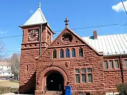 The Ansonia Library stands in a mainly residential area a short way east of downtown Ansonia, on a triangular parcel at the junction of South Cliff Street and Cottage Avenue. It is a two-and-a-half-story building with load-bearing brownstone walls, 82 by 70 feet (25 m × 21 m) in plan. Its walls are 2 feet (0.61 m) and thicker. Its asymmetrical plan is visually dominated by a square tower on the left side, with a clock in its upper stage and a pyramidal copper roof. The main entrance is set near the center of the South Cliff facade, recessed under a large round arch. The gable above the entrance has a rose window near its peak.[2]