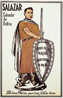 Opposed to communism, socialism, syndicalism and liberalism, Salazar's rule was conservative, corporatist and nationalist in nature; it was also capitalist to some extent although in a very conditioned way until the beginning of the final stage of his rule, in the 1960s.[4] Salazar distanced himself from fascism and Nazism, which he described as a "pagan Caesarism" that did not recognize legal, religious, or moral limits.[5] Throughout his life Salazar avoided populist rhetoric.[6] Salazar was generally opposed to the concept of political parties when, in 1930, he created the National Union. Salazar described and promoted the party as a "non-party",[7] and announced that the National Union would be the antithesis of a political party.[7] He promoted Catholicism, but argued that the role of the Church was social, not political, and negotiated the Concordat of 1940 that kept the church at arm's length. One of the mottos of the Salazar regime was Deus, Pátria e Família ("God, Fatherland and Family"), although he never turned Portugal into a confessional state.[8][9]
