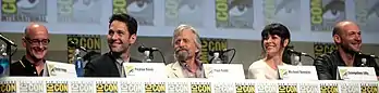 In October 2013, Wright revealed that he was in Los Angeles to work on Ant-Man by tweeting a photograph from the production of the June 2012 test reel.[97] Joseph Gordon-Levitt and Paul Rudd were soon being considered for the lead role,[98] though Gordon-Levitt dismissed his consideration as a rumor.[99] Feige stated that Ant-Man would be a "heist movie", and that a casting announcement for Hank Pym would come before the end of 2013.[100] The next month, Feige stated that Eric O'Grady's Ant-Man would not be featured in the film,[101] while Rudd became the front-runner to play Hank Pym, and casting for the character's girlfriend had begun.[102] Around that time, the filmmakers' intentions to shoot in the United Kingdom were dashed because of a lack of studio space, which Wright believed was due to the plan by Pinewood Shepperton to add fifteen studios to their facility, which was rejected in part by the local council in May 2013 because the project was eyeing protected land.[103][104] By the end of the month, the film was scheduled to be shot in the U.S. instead.[105]