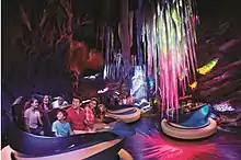 The vehicle travels around an indoor Antarctic environment, spinning to view a variety of scenery and projection screens. The story which began in the pre-show continues, with Puck venturing out into the sea. When he is underwater, Puck is chased by a leopard seal before resurfacing on land. The ride's theme song – "Antarctica: One World, One Family" by Lauren Alaina[18] – is then played as guests watch a live penguin habitat behind glass before the vehicle returns to a four-platform unloading station.[17][19]