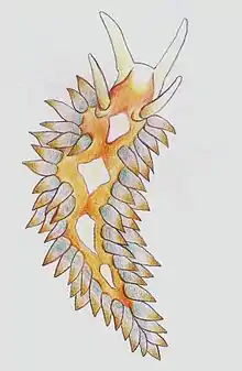 Bergh[3] described this species based on Moebius’ drawings and notes. The coloration of the living animal was depicted as white, yellow, and grey, including the oral tentacles and the rhinophores. Miller[4] designated Aeolidiella indica as the type species of Anteaeolidiella, although his specimen did not match the coloration described by Bergh and was probably Anteaeolidiella lurana.[2]