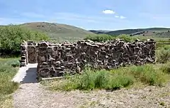 The springs emerge at 104 °F (40 °C) in a semi-improved, accessible location suitable for camping within Hart Mountain National Antelope Refuge.[1] The pool is about 5 feet deep and 9 by 12 across (150 cm deep, 3 m x 4 m).[3] The pool can accommodate six people.[4] A posted sign requests that nudists lock the door, though one author suggests the remote location renders such formality unnecessary.[5]