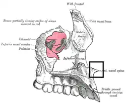 ![]() Left maxilla. Nasal surface (anterior nasal spine labeled at bottom right) | |