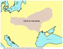 The Antes, or Antae (Greek: Ἄνται), were an early East Slavic tribal polity of the 6th century CE. They lived on the lower Danube River, in the northwestern Black Sea region (present-day Moldova and central Ukraine), and in the regions around the Don River (in Middle and Southern Russia).[1] Scholars commonly associate the Antes with the archaeological Penkovka culture.[2][3][4][5]