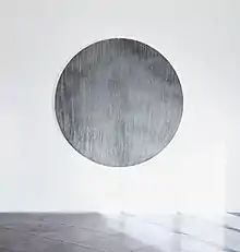 Shields was an exhibition of curved disks made of brass, bronze, and steel "scarred with minimalist markings." This series "operates elusively, staggering between the iconic and the arbitrary, the concrete and the alchemic, the mythical and experiential."[6] James describes his work as "evoking pictorial depictions of the cosmos, alluding to notions of mysticism, ethereality, and science fiction, all the while anchored through the use of weighty, industrial materials such as metal."[7] The shields "read as relics or artifacts from some liminal moment, as such, James attempts to locate beauty in the wake of insanity."[8]