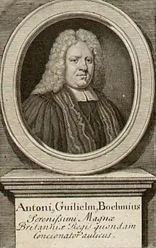 Anton Wilhelm Böhme (English: Anthony William Boehm) (1 June 1673 – 27 May 1722) was a German Lutheran royal chaplain at St. James's Palace in London. He is known as an author and translator.