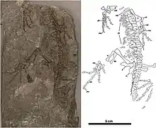 Anthracodromeus was between 15 and 20 cm long when alive, with about 5 cm of this being tail.[3] It had a long body, with 27 vertebrae between the five cervical vertebrae and the sacrum. Each vertebra had a short pair of ribs attached to it. The limbs were quite short, but each foot was at least 2 cm long - as long as the rest of the limb put together. There are 20 caudal vertebrae in the tail, but unlike the thoracic/lumbar vertebrae, these do not have neural spines. The scapulae and much of the skull are missing, as is the lower jaw. The parietals, temporals and occipitals are present, as is the edge of the eye socket, but nothing further forward than this.[1] A new specimen with preserved limbs shows that the phalanges were elongated and unguals that are strongly curved at the tips, which indicates that it was at least partially adapted for climbing, though not to the degree that it was obligately arboreal.[2]