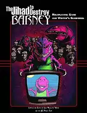 The Jihad to Destroy Barney is a fictional jihad that sees itself in the ultimate battle against Barney (spelled B'harne therein) and his followers. It is described as "a heterogeneous organization of people on the Internet dedicated to defamation, humiliation, eradication, killing, and removal of Barney the Purple Dinosaur of the television show Barney & Friends from the airwaves and from every human's life."[36][37] B'harne is depicted as a purple, scaly lizard-like demon with sharp talons, long teeth and glowing evil red eyes.