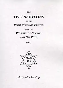 Alexander Hislop's pseudohistorical work The Two Babylons (1858) asserted that the Roman Catholic Church originated from a Babylonian mystery religion, claiming that its doctrines and ceremonies are a veiled continuation of Babylonian paganism.