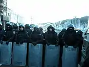A pro-government counter protest reportedly gathered 10,000 people on 25 November.[3] The Party of Regions allegedly paid UAH₴100 to its supporters to participate in a three-hour rally, with supporters calling for "building Europe in Ukraine [...] but on terms and conditions favourable for Ukraine".[4] According to the Kyiv Post, demonstrators held anti-EU and homophobic banners.[5] On 29 November a 2-hour 3,000 people strong pro-government rally took place on European Square.[6][7] Party of Regions member of parliament Vladyslav Lukianov told the crowd: "I'm sure that our movement to Europe will never change. We support this choice. Let the land shatter from our steps. Together we will win".[6][8] The Kyiv Post again reported incentives were given to attend and described attendants in appearance "to be homeless; still more look drunk. The crowd consists mostly of men".[6] Euronews spoke of many being "bused in from the east of the country where pro-Russian sentiment is strong. They, too, carried national flags as well as those of the ruling Party of Regions".[9] Many in the crowd refused to talk to Euronews.[10]