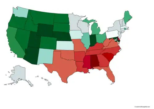 In the United States, anti-miscegenation laws were passed by most states to prohibit interracial marriage, and in some cases also prohibit interracial sexual relations. Some such laws predate the establishment of the United States, some dating to the later 17th or early 18th century, a century or more after the complete racialization of slavery.[1] Nine states never enacted such laws; 25 states had repealed their laws by 1967, when the United States Supreme Court ruled in Loving v. Virginia that such laws were unconstitutional (via the 14th Amendment adopted in 1868) in the remaining 16 states.[2][3] The term miscegenation was first used in 1863, during the American Civil War, by journalists to discredit the abolitionist movement by stirring up debate over the prospect of interracial marriage after the abolition of slavery.[4]