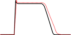 The cardiac myocyte has two general types of action potentials: conduction system and working myocardium. The action potential is divided into 5 phases and shown in the diagram. The sharp rise in voltage ("0") corresponds to the influx of sodium ions, whereas the two decays ("1" and "3", respectively) correspond to the sodium-channel inactivation and the repolarizing efflux of potassium ions. The characteristic plateau ("2") results from the opening of voltage-sensitive calcium channels. Each phase utilizes different channels and it is useful to compare theses phases to the most common classification system — Vaughan Williams — described below.