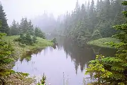 The forests of Anticosti Island are typical boreal forest, with common species such as white spruce, balsam fir, and black spruce. It is distinguished by some minor stands of American white birch and trembling aspen. Balsam fir is slowly being replaced with white spruce because of intensive grazing done by deer and by periodic outbreaks of hemlock looper and spruce budworm.[6][15] About a quarter of the island is covered by peat lands.[16]
