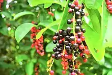 The species is dioecious, with male and female flowers growing on separate trees. The flowers have a strong, somewhat unpleasant scent. The staminate flowers are arranged in small bunches and the pistillate flowers grow on long racemes which will become the long strands of fruit. The fruits are spherical and just under 1 cm (1⁄2 in) wide, hanging singly or paired in long, heavy bunches. They are white when immature and gradually turn red, then black.