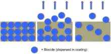 Marine Biofouling is described as the undesirable buildup of microorganisms, plants, and animals on artificial surfaces immersed in water.[46] Significant buildup of biofouling on marine vessels can be problematic. Traditionally, biocides, a chemical substance or microorganism that can control the growth of harmful organisms by chemical or biological means, are used in order to prevent marine biofouling. Biocides can be either synthetic, such as tributyltin (TBT), or natural, which are derived from bacteria or plants.[46] TBT was historically the main biocide used for anti-fouling coatings, but more recently TBT compounds have been considered toxic chemicals which have negative effects on human and environment, and have been banned by the International Maritime Organization.[47] The early design of anti-fouling coatings consisted of the active ingredients (e.g. TBT) dispersed in the coating in which they "leached" into the sea water, killing any microbes or other marine life that had attached to the ship. The release rate for the biocide however tended to be uncontrolled and often rapid, leaving the coating only effective for 18 to 24 months before all the biocide leached out of the coating.[47]