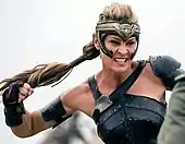 - Antiope appears in the 2017 film Wonder Woman, portrayed by Robin Wright.[15] Director Patty Jenkins said of Wright's casting, "For Antiope, I needed someone who seems under control and is not overly aggressive, but who is truly a badass."[16] Producer Charles Roven calls the character "the greatest warrior of all time".[17] In the film, Diana is jointly raised by Queen Hippolyta, her sister General Antiope, and Lieutenant Menalippe; while Hippolyta wants to shield young Diana from the outside world, Antiope wants to train her as a warrior.[15] Hippolyta and Antiope share the secret that Diana is Hippolyta's daughter with the god Zeus, and that their nemesis, the war god Ares, will someday try to destroy her as he did the other gods who opposed him. Going against Hippolyta's wishes, Antiope secretly trains Diana in combat,[3] and ultimately convinces Hippolyta that though Diana's use of her powers will attract Ares, only learning to use them can save her. When the Germans later invade Themyscira in pursuit of Steve Trevor, Antiope sacrifices herself to save Diana by taking a bullet fired from a German marine that was meant to target Diana. Hippolyta gifts Diana with Antiope's tiara when she leaves the island to accompany Steve back to Europe.