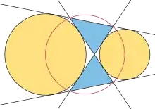 An antiparallelogram is a special case of a crossed quadrilateral, with two pairs of equal-length edges.[3] In general, crossed quadrilaterals can have unequal edges.[3] A special form of the antiparallelogram is a crossed rectangle, in which two opposite edges are parallel.[4] Every antiparallelogram is a cyclic quadrilateral, meaning that its four vertices all lie on a single circle.[3] Additionally, the four extended sides of any antiparallelogram are the bitangents of two circles, making antiparallelograms closely related to the tangential quadrilaterals, ex-tangential quadrilaterals, and kites (which are both tangential and ex-tangential).[5]